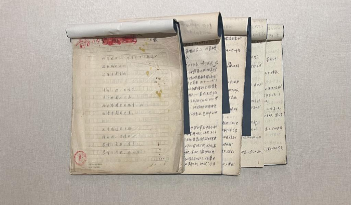 在展覽“青春萬(wàn)歲”單元,一件珍貴的展品吸引眾人目光——5卷泛黃的稿紙上,寫著一行行藍(lán)色鋼筆字,這正是王蒙創(chuàng)作《青春萬(wàn)歲》的初稿。