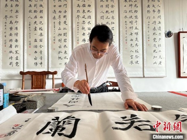 8月26日,甘肅通渭悅心國際書畫村,書法家在工作室創(chuàng)作。閆姣 攝