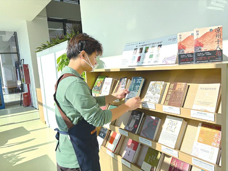 1月1日上午,深圳信息職業(yè)技術(shù)學(xué)院湖畔書(shū)吧店長(zhǎng)蔡錦元在整理書(shū)架、碼放圖書(shū)。