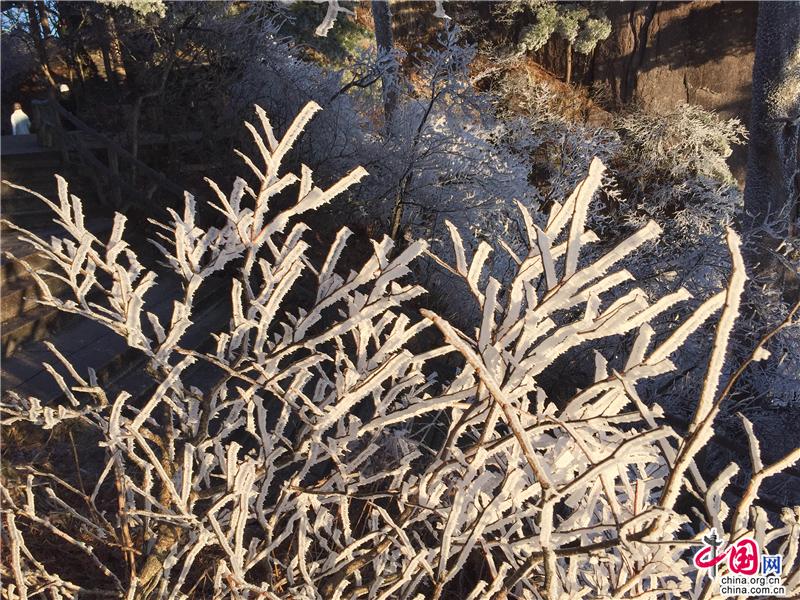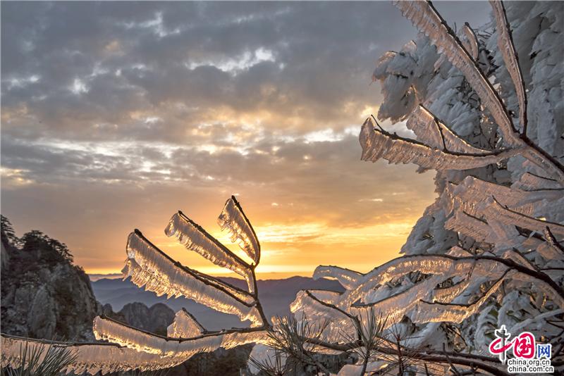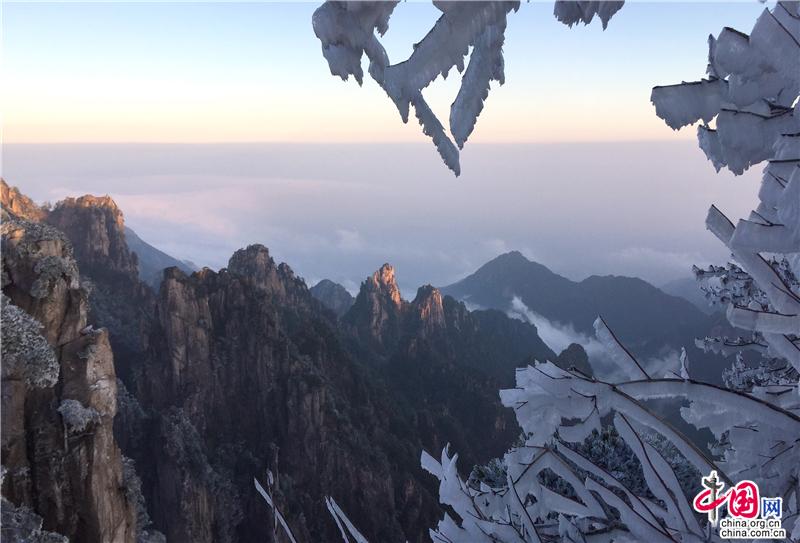 2019年最后一天黃山風景區(qū),出現(xiàn)壯觀的日出、霧凇、云海景觀,到處銀妝素裹,冰雕玉砌,“一夜寒風起,萬樹銀花開”,置身其間,仿佛進入撲朔迷離的童話世界,給來山的游客帶來意外的驚喜。