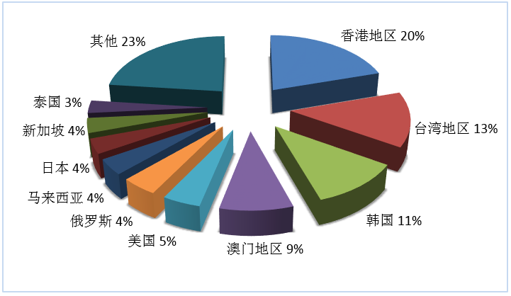 圖2:第三季度入境旅游接待人次排名前十位的客源地國家或地區(qū)