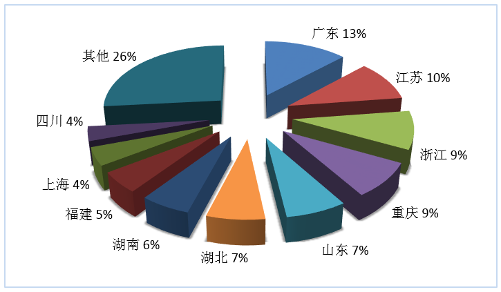第三季度旅行社國內旅游組織人次排名前十位的地區(qū)由高到低依次為廣東、江蘇、浙江、重慶、山東、湖北、湖南、福建、上海、四川(見圖3)。
