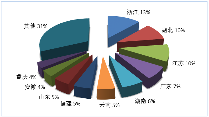 第三季度旅行社國內旅游接待人次排名前十位的地區(qū)由高到低依次為浙江、湖北、江蘇、廣東、湖南、云南、福建、山東、安徽、重慶(見圖4)。