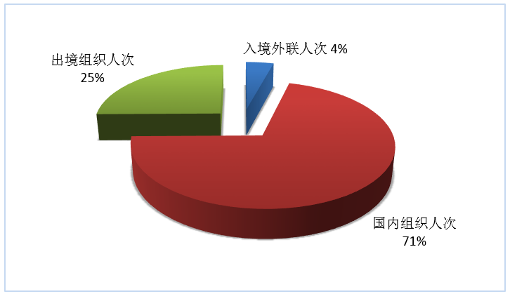 按照入境外聯(lián)人次、國內組織人次、出境組織人次三項指標,入境旅游、國內旅游、出境旅游市場人次所占份額依次為4%、71%和25%(見圖6)。