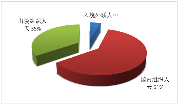 按照入境外聯(lián)人天、國內組織人天、出境組織人天三項指標,入境旅游、國內旅游、出境旅游市場人天所占份額依次為4%、61%、35%(見圖7)。