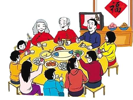 人們辛苦了整整一年,除夕晚上全家老小定要團圓,在家中吃團圓餃子。餃子形如元寶,取“招財進寶”之意,餃子餡中可以包進硬幣和干果,以寄托人們對新年的一種祈盼。這頓年夜飯可以從傍晚一直吃到天黑,席間人們多彼此祝愿的話語,充滿歡樂溫馨氣氛。