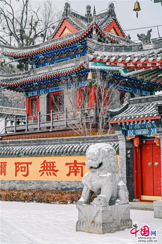 聽說這座寺廟的歷史可以追溯到400多年前,門前的石獅子十分莊嚴,傳遞著佛門圣地的意境。腳踩在雪地上,發(fā)出“嘎吱嘎吱”的聲音;進入了廟內,就能看見白雪覆蓋的木質小橋;還有廟宇內回廊上精致的鏤空鉤花和印著“溫泉寺”字樣的燈籠。