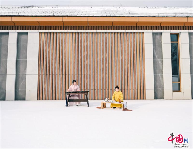 寺廟高處,古榕旁、雪地上,還有另一位古風裝束之人在彈奏古箏,聲意蕭瑟。伴隨空靈的山河意境,飄至遠方。冬季最美的畫面,也不過如此。