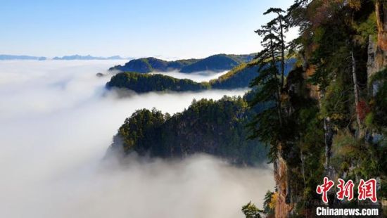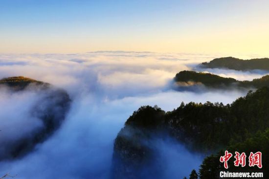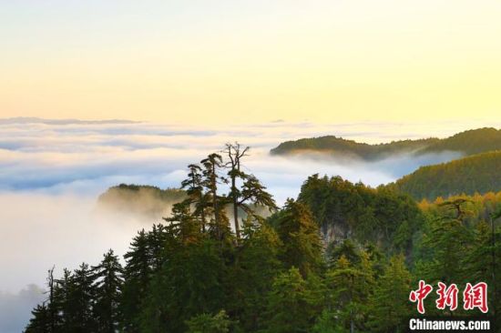 10月上旬,甘肅省定西市漳縣貴清山國(guó)家森林公園,朝陽(yáng)在云層中若隱若現(xiàn),云遮霧繞的景象讓層巒疊嶂的山峰成為“云端村落”,仿若仙境。漳縣貴清山國(guó)家森林公園境內(nèi)原始森林遍布,森林、動(dòng)植物資源十分豐富,貴清山被譽(yù)為隴中的“小華山”,是生態(tài)旅游勝地。