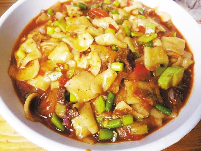 蘭州尕面片的配菜無(wú)定式,按照季節(jié)的不同,加入彩椒、番瓜、韭黃、西紅柿等時(shí)蔬,怎么香怎么來(lái),讓一碗小小的面片平添幾分田園意蘊(yùn)。