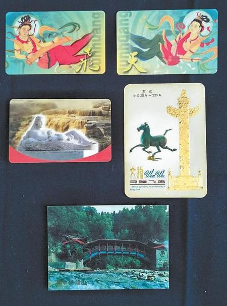 甘肅的自然風(fēng)光優(yōu)美,人文歷史悠久,經(jīng)過不斷挖掘,精心保護(hù),成為人們旅游、觀光的理想之地。北京中鈔信用卡廠于2001年制作的“飛”字片、“天”字片“飛天”對(duì)卡年歷片,中國(guó)工商銀行甘肅分行于2000年設(shè)計(jì)了《黃河母親》年歷片,中國(guó)農(nóng)業(yè)銀行甘肅分行于1987年設(shè)計(jì)的《興隆山握橋風(fēng)光》年歷片,中國(guó)遠(yuǎn)洋運(yùn)輸公司上海分公司于1978年制作的《馬踏飛鳥》年歷片,都為甘肅旅游風(fēng)光作了宣傳。