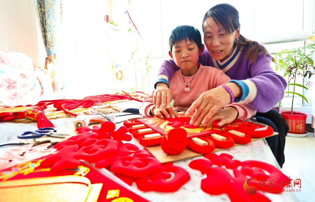 1月6日,甘肅民樂(lè)生態(tài)工業(yè)園區(qū)的巾幗扶貧車(chē)間內(nèi),女工們正在教授小朋友編織中國(guó)結(jié)。