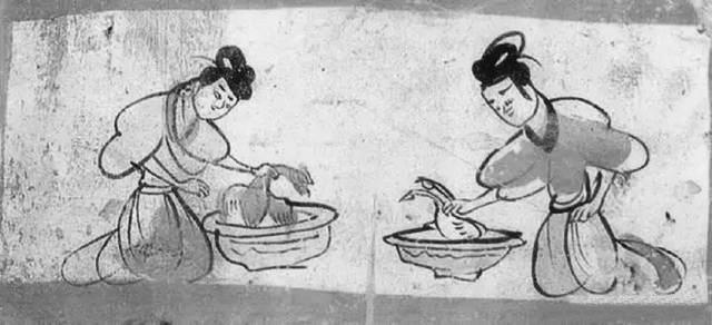 燙雞圖壁畫磚就出土于5號墓葬,這是繪制在一塊單塊磚面上的壁畫,磚面上用刷得甚薄的含膠白堊土作底,正中繪制二婢相對跪坐,袖子高高挽起,眉毛微撇,聚精會神地在各自的盆內燙雞去毛。左邊盆內雞有冠,為公雞形象;右邊盆內雞無冠,似為母雞形象。用色較為單純,以墨、赭石和朱為主。畫面寥寥數筆,將婢女勞動的情況表現得淋漓盡致,極具生活趣味。尤其是雞脖子被抓住的樣子非常傳神, 生動地表現出寫實的情境。我們從中可以看到,1600多年前的人們殺雞處理食材,跟現在我們殺雞燙毛毫無二致。