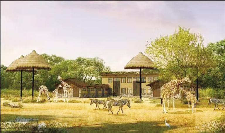 非洲草原區(qū)籠舍和展館主要位于中心位置,建筑風(fēng)格以非洲部落建筑形式為主,體現(xiàn)非洲原始部落生活風(fēng)貌。這里有狒狒館、鬣狗館、非洲草原混養(yǎng)區(qū)(長(zhǎng)頸鹿和斑馬籠舍、羚羊館)河馬館和黑猩猩館。