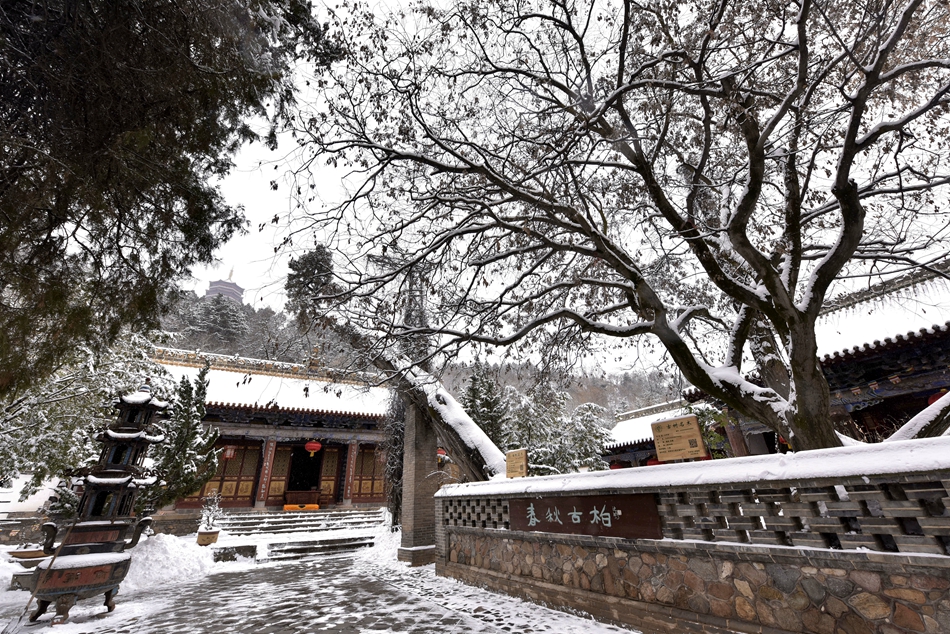 夏日炎炎,站在凈土寺觀音殿的高階之上,一聲鐘罄聲響起,仿佛震醒了山風(fēng),松濤幽碧隨之蕩漾,似是滌蕩了人間心塵,五蓮峰拖起紅墻青翠,中國古典色彩之美盡顯灑脫。雪落禪院,更是青松點翠,斗拱擎雪,莊嚴(yán)而不失華麗,踏雪只為聽靜中天籟聲。