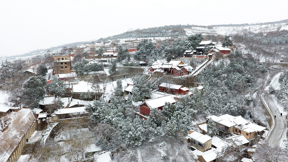 群峰環(huán)列,渭水在南北兩山間由西向東流過,形成一幅天然的太極圖。雪中透出大地色的樸拙,給予山川大地最初的模樣,層層繞繞的山路,修葺出渾然天成的萬物法則,也訴說著亙古不變的始祖智慧之起源。