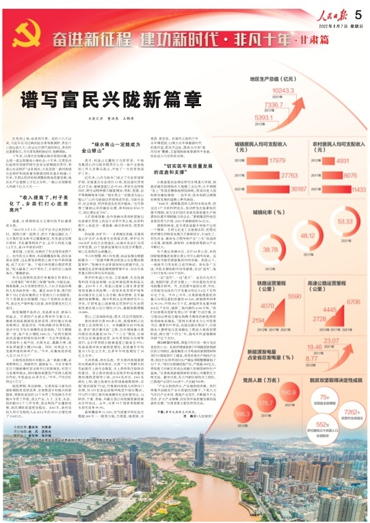 8月7日,人民日報(bào)刊發(fā)“奮進(jìn)新征程 建功新時(shí)代·非凡十年”甘肅篇,重磅推出兩塊整版,聚焦黨的十八大以來,隴原兒女牢記習(xí)近平總書記的殷切囑托,踔厲奮發(fā)、銳意進(jìn)取,埋頭苦干、勇毅前行,加快建設(shè)幸福美好新甘肅,不斷開創(chuàng)富民興隴新局面。