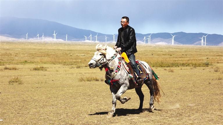 驅(qū)車向草原腹地進發(fā),遠(yuǎn)遠(yuǎn)就能看見有人在馴馬。馴馬者房利軍和他的坐騎“尕青”仿佛“人馬合一”,同呼吸、共步調(diào),一遍遍練習(xí),像走,更像飛。這便是傳說中的走馬文化,和跑馬的加速度不同,走馬不管是走還是跑,都是快步勻速,短途速度快,長途耐力強,騎乘平穩(wěn),姿態(tài)優(yōu)美,觀賞性強。在牧區(qū),走馬實用性強,深受當(dāng)?shù)厝藲g迎。曾有專家稱,“馬踏飛燕”的“馬”即為走馬。每天,和武威天祝一山之隔的這片草原,都與房利軍有關(guān),在這里,他專心馴馬,而他的500只羊則在一旁撒歡。尤其從高空俯瞰,草原牧羊的畫面甚是壯觀??赐犟Z馬,房利軍騎馬帶路,采訪車沿著馬道回到了“家”。