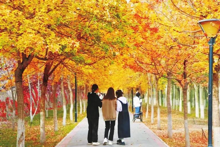 微風輕拂,嬌黃的樹葉紛紛飄落,陽光透過葉片滲出幾分清朗,這是專屬秋的浪漫。隨便鋪開畫紙,蘸取一點點秋色,藍天、紅墻、金葉……都是最美的色調。古樸靜雅的校園彌漫著秋思,斑駁的陽光灑在圖書館的墻上,在濃濃的書卷氣中把農歷十月寫進秋的詩行,有思念、有沉淀、有墨香……蘭州“醉”美的大學校園,每一片落葉都是美的化身,綿延了時光,溫情了步履……