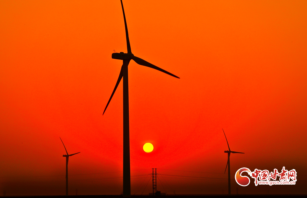 11月17日,甘肅省張掖市甘州區(qū)平山湖蒙古族鄉(xiāng)的草原上,龍?jiān)措娏Ω拭C平山湖風(fēng)電場66臺(tái)風(fēng)電機(jī)組高高聳立,碩大的風(fēng)輪迎風(fēng)不息,與晚霞相映成景。
