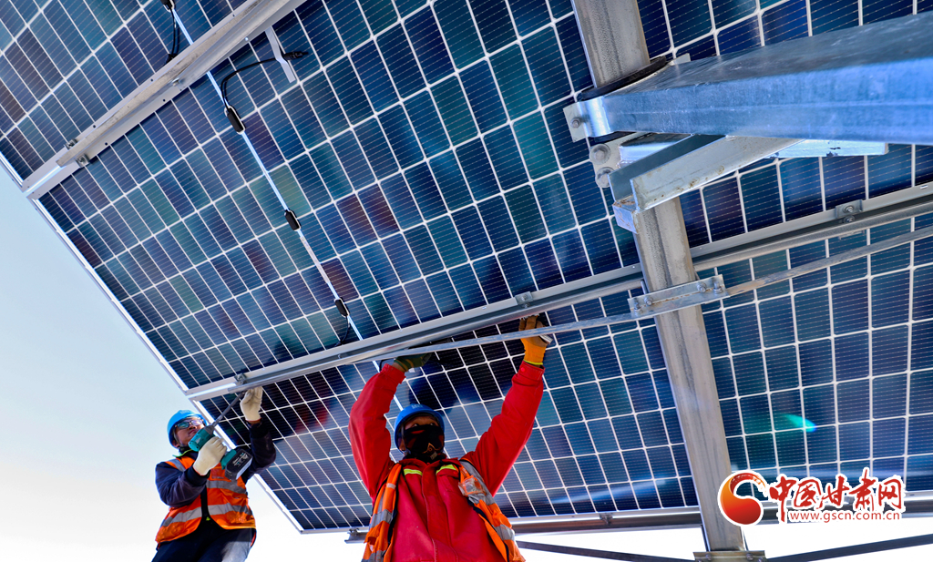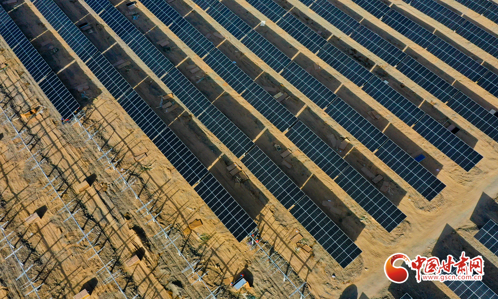 11月17日,甘肅省張掖市甘州區(qū)南灘中能綠電南灘30萬千瓦光伏建設(shè)現(xiàn)場,工人們正在安裝光伏板。