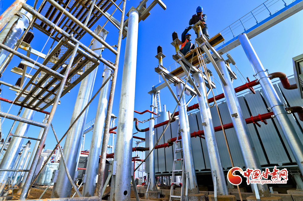 11月17日,甘肅省張掖市甘州區(qū)南灘中能綠電南灘30萬千瓦光伏建設(shè)現(xiàn)場,工人們正在進(jìn)行變電設(shè)備安裝。