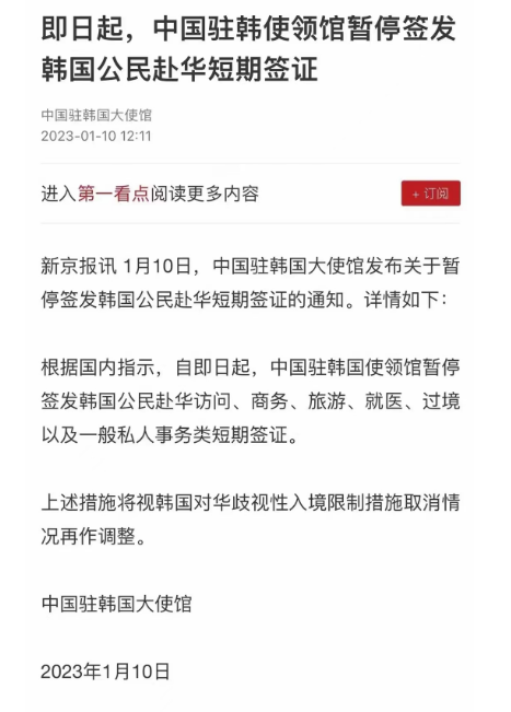 今天,中國駐韓國大使館發(fā)布《關(guān)于暫停簽發(fā)韓國公民赴華短期簽證的通知》(以下簡稱《通知》)。通知稱,根據(jù)國內(nèi)指示,自即日起,中國駐韓國使領(lǐng)館暫停簽發(fā)韓國公民赴華訪問、商務(wù)、旅游、就醫(yī)、過境以及一般私人事務(wù)類短期簽證。