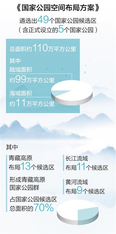 在空間布局上,遴選出49個(gè)國家公園候選區(qū)(含正式設(shè)立的5個(gè)國家公園),總面積約110萬平方公里,其中陸域面積約99萬平方公里、海域面積約11萬平方公里,占陸域國土面積的10.3%。充分銜接國家重大戰(zhàn)略和重大生態(tài)工程,其中,青藏高原布局13個(gè)候選區(qū),形成青藏高原國家公園群,占國家公園候選區(qū)總面積的70%;長江流域布局11個(gè)候選區(qū),黃河流域布局9個(gè)候選區(qū)。全部建成后,中國國家公園保護(hù)面積的總規(guī)模將居世界第一。
