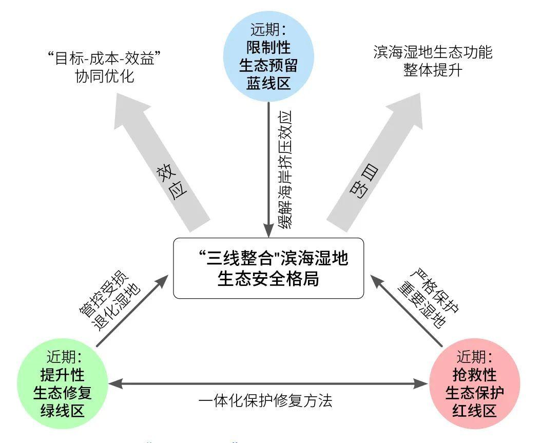 據(jù)此,文章提出了應(yīng)對(duì)圍墾開發(fā)和適應(yīng)海平面上升情形下“三線整合”中國(guó)濱海濕地生態(tài)安全格局相關(guān)概念,包括:搶救性保護(hù)生態(tài)紅線區(qū),優(yōu)先開展?jié)竦匦迯?fù)的生態(tài)修復(fù)綠線區(qū),以及適應(yīng)氣候變化影響下海平面上升的生態(tài)預(yù)留藍(lán)線區(qū)。文章在剖析相關(guān)概念的基礎(chǔ)上,聚焦我國(guó)大江大河三角洲,針對(duì)濱海濕地保護(hù)修復(fù)、海岸帶管理和國(guó)土空間開發(fā)提出了相關(guān)措施和建議。