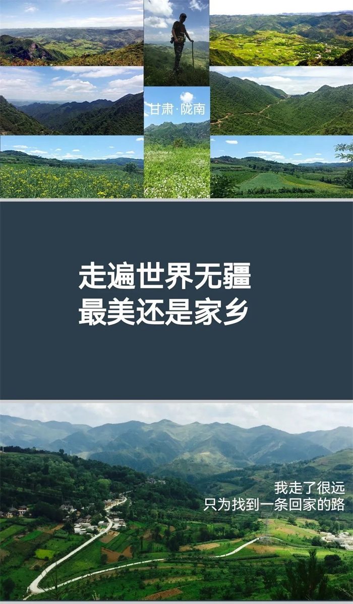 我每次回到西北各省區(qū)參加活動,做演講分享時,總會放幾頁PPT介紹我的家鄉(xiāng)——大隴南,配圖都是我拍攝的我們村莊附近的風光,也經(jīng)常說一句話——“走遍世界無疆,最美還是家鄉(xiāng)”,不辭長作隴南人。