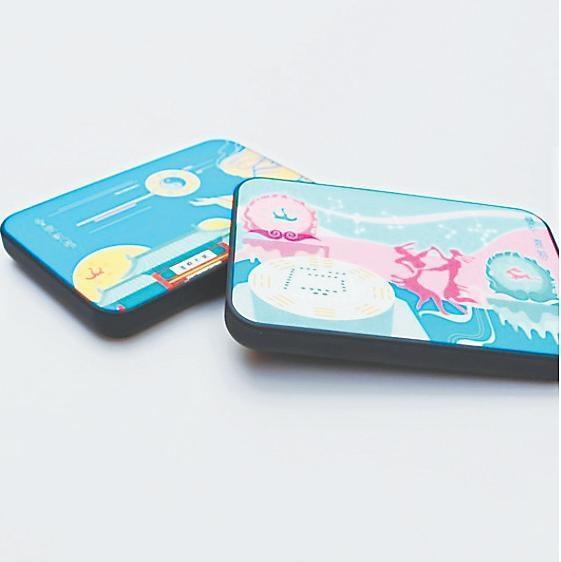 圖案來源于伏羲女媧因分別從山頂推下的兩磨盤緊緊結(jié)合的現(xiàn)象驗(yàn)證了上蒼意圖,決定繁衍后代的傳說?;瘌B騰飛之日與玉兔奔騰之月隔著天河星辰分懸兩邊,繪有河圖的磨盤見證生命的起源,雙人自由舞動的身軀揚(yáng)起歡騰的節(jié)律,完美契合于陰陽諧振的樂音。美好寓意的組合充溢起整個(gè)載體,令人傾心又矚目于彩色流韻的真景里。