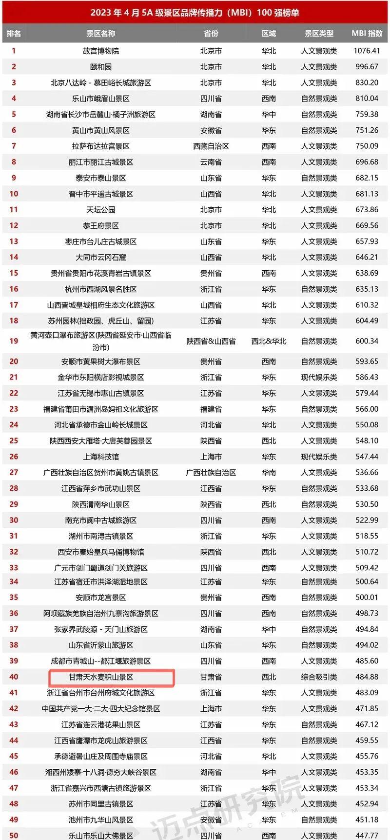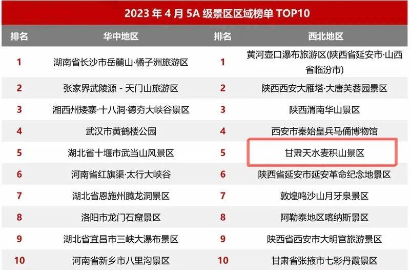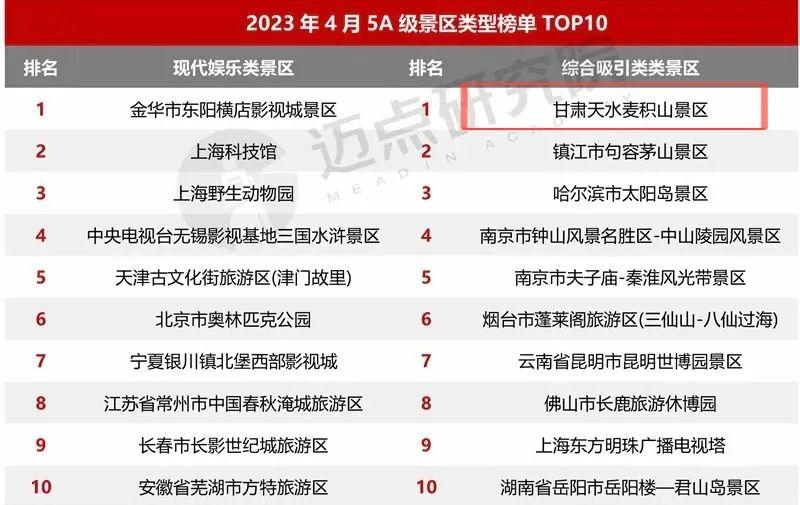 2023年4月5A級景區(qū)品牌傳播力100強(qiáng)榜單上,熱烈祝賀麥積山景區(qū)榮登國內(nèi)文旅行業(yè)最具影響力的權(quán)威數(shù)據(jù)分析機(jī)構(gòu)“邁點(diǎn)研究院”4月5A級旅游景區(qū)品牌傳播力百強(qiáng)榜單前五十和綜合類旅游景區(qū)第一、西北地區(qū)分項(xiàng)榜單第五。