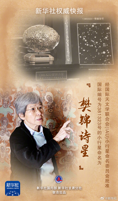 7月10日,樊錦詩從事敦煌文物工作60年座談會(huì)在敦煌舉行。會(huì)上正式命名了編號(hào)381323小行星為#樊錦詩星#。繼向北京大學(xué)捐資1000萬元支持敦煌學(xué)研究后,樊錦詩再向中國敦煌石窟保護(hù)研究基金會(huì)捐資1000萬元,用于敦煌文物事業(yè)發(fā)展和急需人才培養(yǎng)。捐款來自樊錦詩所獲獎(jiǎng)金及個(gè)人積蓄。(記者:張玉潔 施雨岑 張智敏)