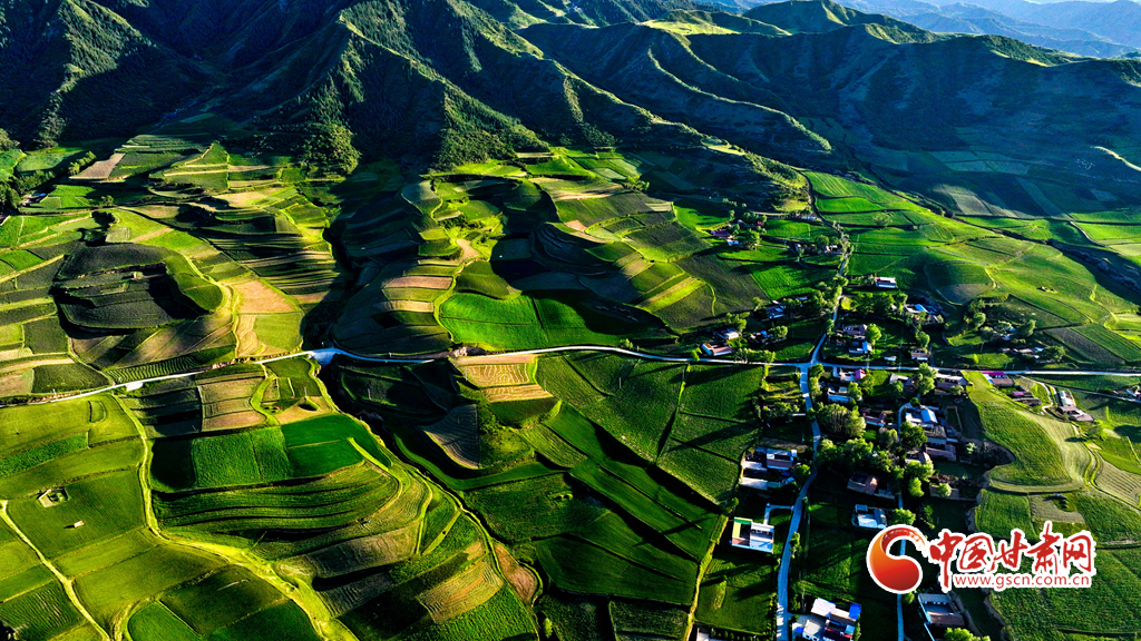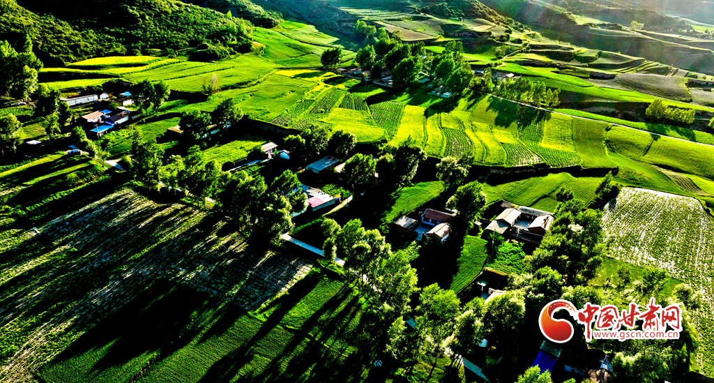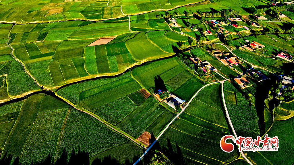 夕陽映襯下的祁連山北民樂縣豐樂鎮(zhèn)易家灣村,綠油油的莊稼生長旺盛,林木蓊郁層林盡翠,呈現(xiàn)出生機勃勃的景象,猶如“巨幅綠毯”。