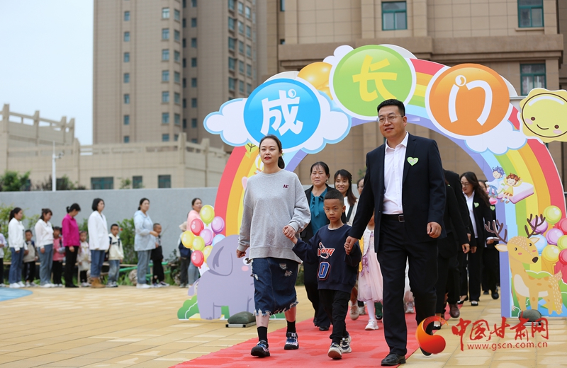 一年級新生在老師和家長的陪伴下走過“成長門”