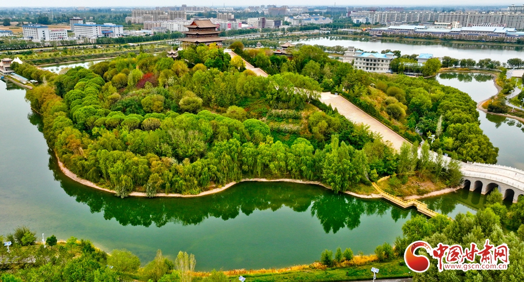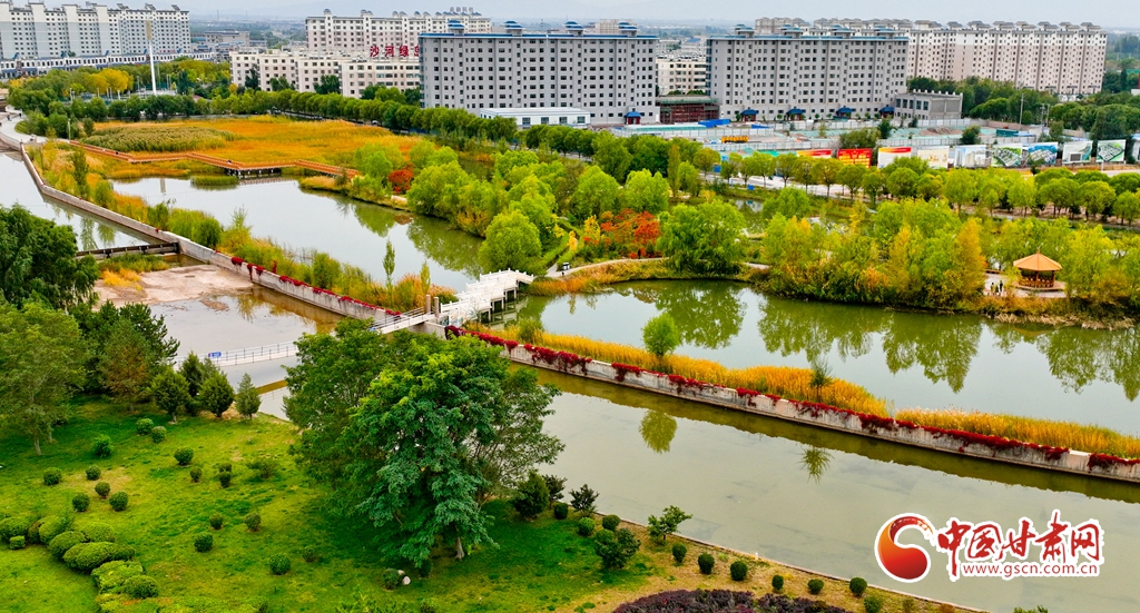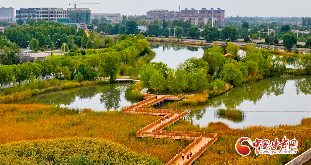 10月5日,鳥(niǎo)瞰甘肅省張掖市臨澤縣,人行步道沿湖蜿蜒,湖水清澈潔凈,岸邊美景倒映湖中,一幅繪著水鄉(xiāng)之美的畫(huà)卷躍然眼前。