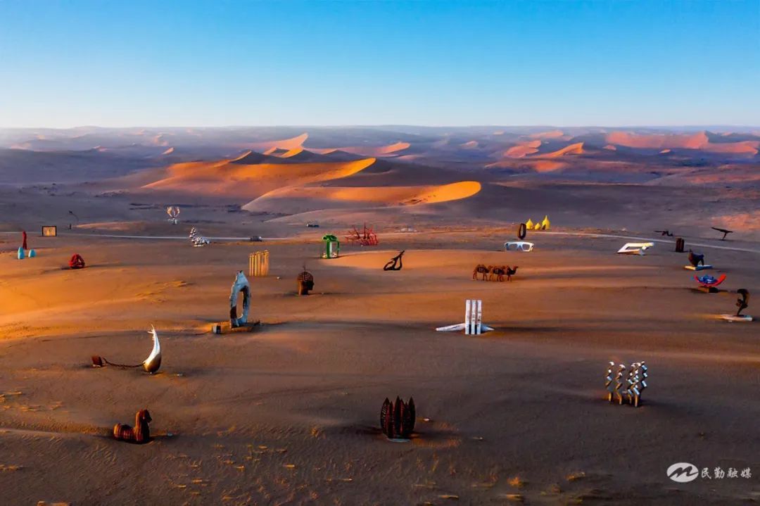 民勤蘇武沙漠景區(qū)絕對是網(wǎng)紅般的存在。刷屏各平臺(tái)它已成為???,沙漠雕塑國際創(chuàng)作營是大家最愛的拍照打卡地,132座不同材質(zhì)、不同風(fēng)格的藝術(shù)佳作,如一顆顆璀璨明珠飄落瀚海,與藍(lán)天白云、金色大漠完美融合、相映成趣,超級出片。