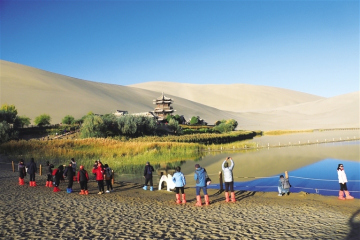 敦煌市鳴沙山·月牙泉景區(qū)被秋色浸染,花草樹(shù)木、藍(lán)天樓閣、泉水沙漠與駝隊(duì)構(gòu)成了一幅迷人畫(huà)卷,吸引眾多游客前來(lái)領(lǐng)略大漠風(fēng)光,體驗(yàn)絲路風(fēng)情。