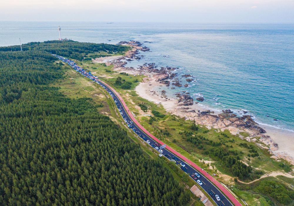 ↑2023年10月4日拍攝的海南環(huán)島旅游公路文昌段景色和自駕游車(chē)輛(無(wú)人機(jī)照片)。新華社記者 蒲曉旭 攝