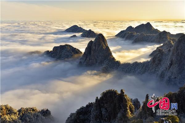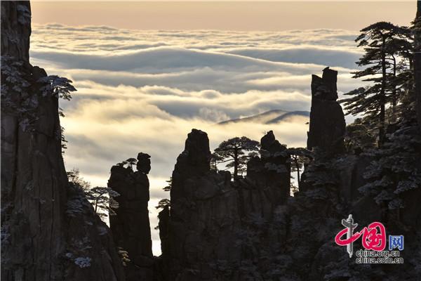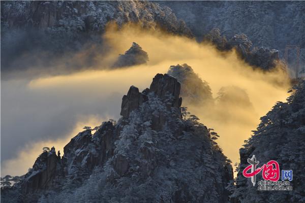 冬天的黃山絕美之處莫不過(guò)于雪景、霧凇、日出、云海同時(shí)出現(xiàn),1月5日雪后早晨一輪紅日冉冉升起,在陽(yáng)光的照耀下,放射出萬(wàn)丈光芒,在群峰間、奇松怪石上散發(fā)著金燦燦的光彩,給冬景增添神奇的色彩,美輪美奐宛如油畫。