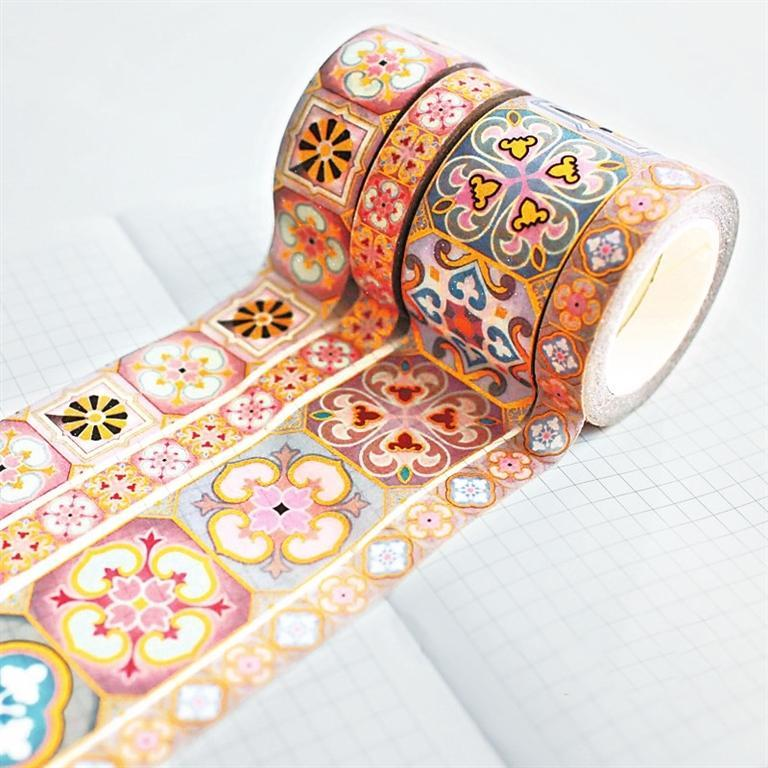 紋樣膠帶——在眾多文創(chuàng)產(chǎn)品中,膠帶的銷售或人氣排行榜靠前。紙膠帶雖是個(gè)小物件,但藝術(shù)化的紙膠帶卻能夠滿足多種需求,適應(yīng)多層次人群的需求。圖形多來自器物上的印刻、繪制圖案,或抽象或具體。這也就體現(xiàn)了兩種效果,一種是文藝范,另一種是趣味感,來自重構(gòu)傳統(tǒng)的高大上,消解歷史的審美觀。設(shè)計(jì)靈感來自中國(guó)傳統(tǒng)紋樣,融合敦煌元素,有層次的色彩斑斕,圖案以及細(xì)節(jié)都恰到好處。