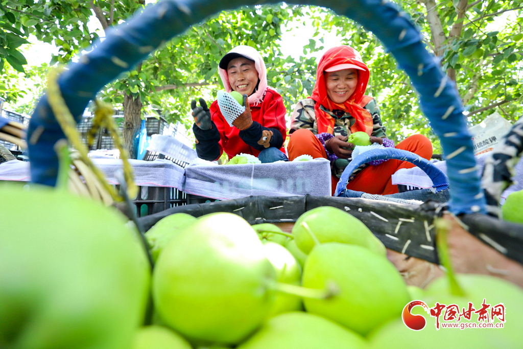 8月12日,在張掖市甘州區(qū)農墾張掖農場綠色果品種植基地,果農們正在采摘成熟的早酥梨,基地里一派果豐人忙的喜人景象。