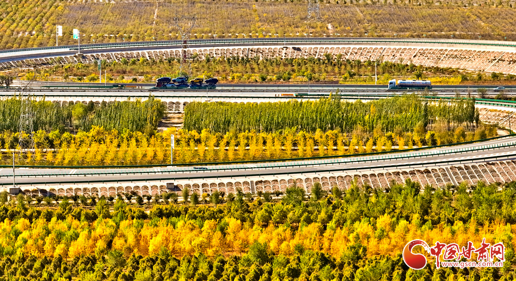 金秋時(shí)節(jié),張掖市甘州區(qū)的黑河兩岸,生態(tài)防護(hù)林的樹葉逐漸披上金色與紅色,景色迷人。尤其是那延綿的人工胡楊林景區(qū),金黃一片,層巒疊嶂,美不勝收。蘭新高鐵與連霍高速穿梭于這片林海之中,構(gòu)成了一幅動(dòng)人的風(fēng)景線。這里的空氣純凈、環(huán)境寧靜、負(fù)氧離子含量豐富,成為了游客和市民休閑觀光的理想之地。