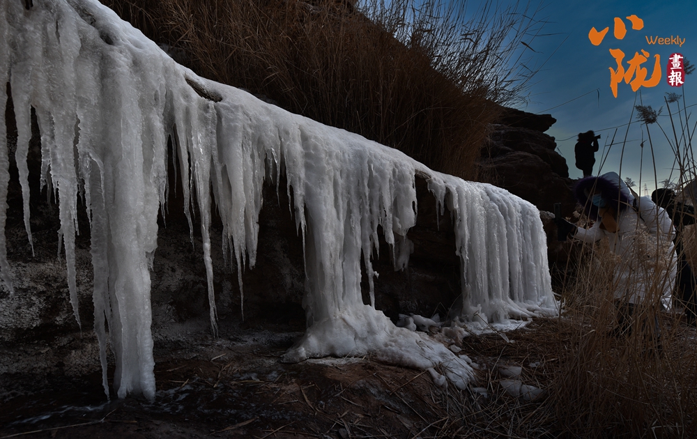 谷底殘雪斑斑積水成冰,形成美麗的冰掛奇觀。