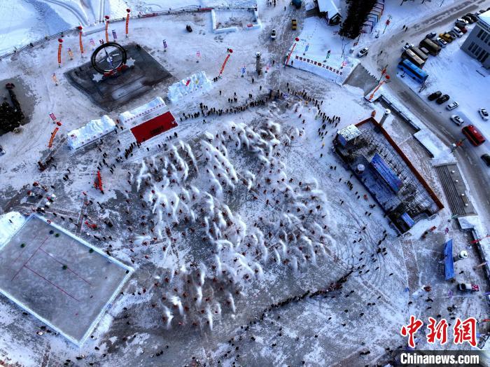 當(dāng)日,北極村七星廣場上,身披紅斗篷、頭戴紅帽子的游客和當(dāng)?shù)鼐用窠M成一個巨大的“53°”造型。伴隨著激情澎湃的音樂,他們擺好姿勢,將手中熱水奮力一灑,齊聲高喊“極致興安嶺 潑出好風(fēng)景”,一道道劃破天際的弧線,碰撞出的神奇光影。震撼的場面讓現(xiàn)場游客驚呼不已,他們紛紛舉起手機(jī)定格這個精彩瞬間。