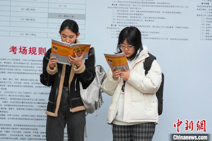 圖為考生在考場外復(fù)習(xí)。中新社記者 楊華峰 攝
