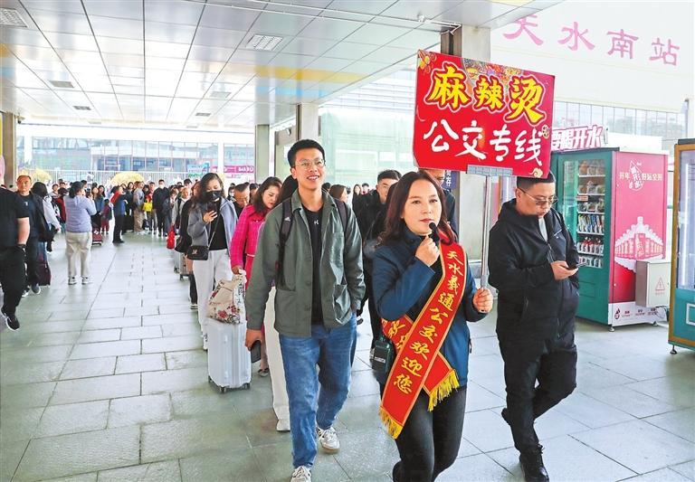 2024年4月3日,志愿者在天水南站引導游客乘坐免費的“麻辣燙公交專線”。新甘肅·甘肅日報記者 高檣