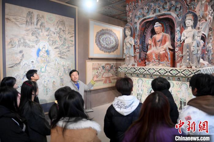 1月14日,甘肅省酒泉市,甘肅酒泉職業(yè)技術(shù)學(xué)院非物質(zhì)文化遺產(chǎn)敦煌彩塑技藝傳習(xí)所內(nèi),學(xué)生們參觀敦煌壁畫(huà)作品。中新社記者 李亞龍 攝