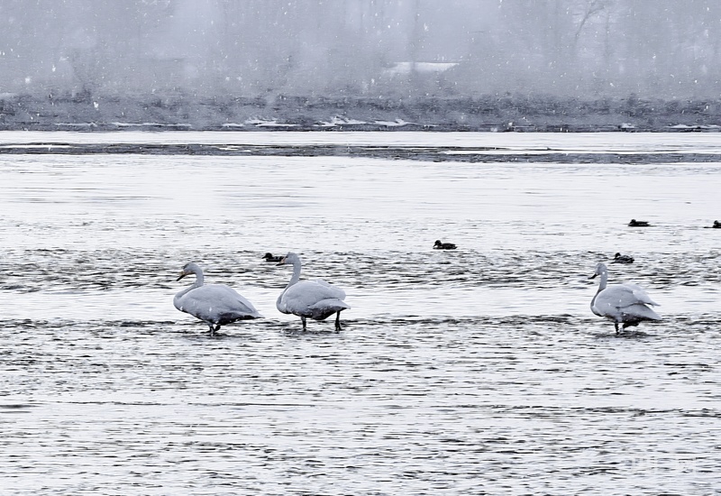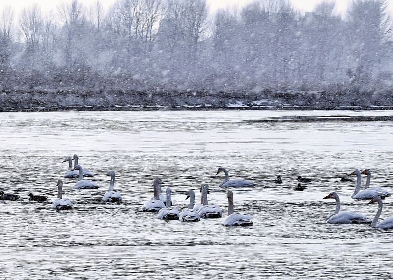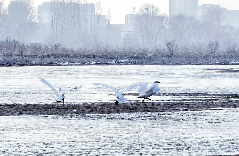 雪落黑河濕地 大天鵝演繹靈動之美
