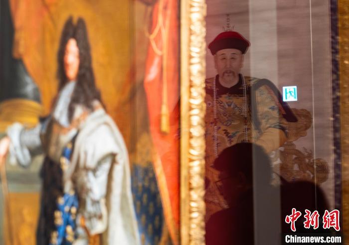 圖為故宮博物院藏《雍正帝朝服像》《康熙帝戎裝像》《孝莊文皇后朝服像》(右一起)和法國《路易十四肖像》(左一)同廳展示。中新網(wǎng)記者 侯宇 攝